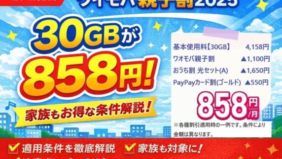 ワイモバイル ワイモバ親子割で30GBが858円!家族も得する条件を解説 ワイモバ親子割2025で30GBが月額858円になる複雑な条件を徹底解説。家族への適用や注意点も網羅 2026.02.01 ワイモバイル