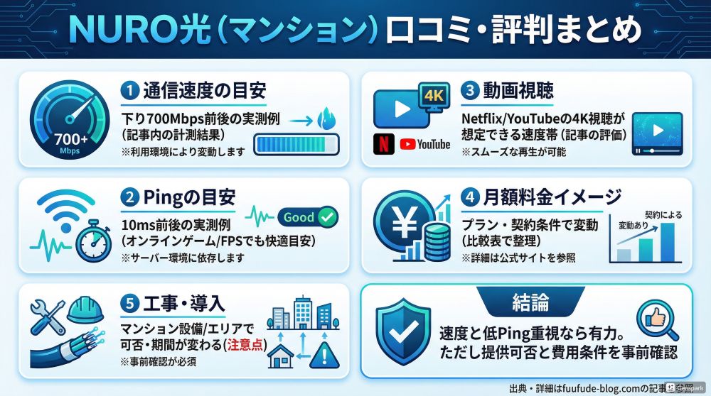 ここまで見てきた口コミや実測データ、実際の使用者の声を総合すると、NURO光マンションは「条件が合えば非常に満足度の高い回線」と言えます。