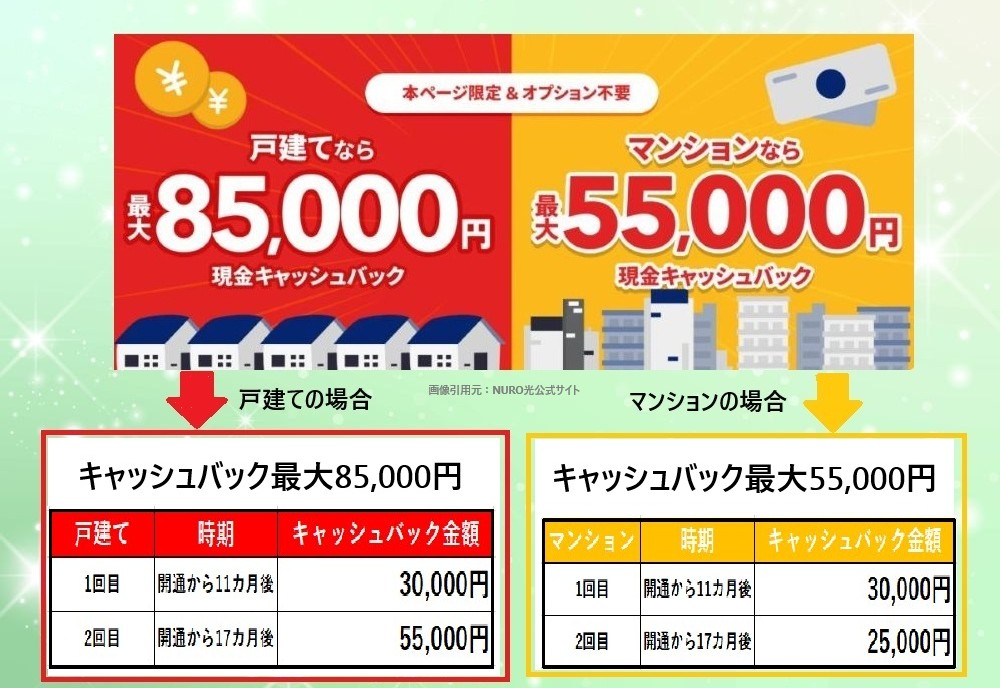 2025年12月現在、「キャッシュバックキャンペーン・特典」を実施している業者の中で、最もお得なのは「NURO光の最大85,000円キャシュバック」です。(※マンションの場合は、キャッシュバックは55,000円です。以下参照ください!)