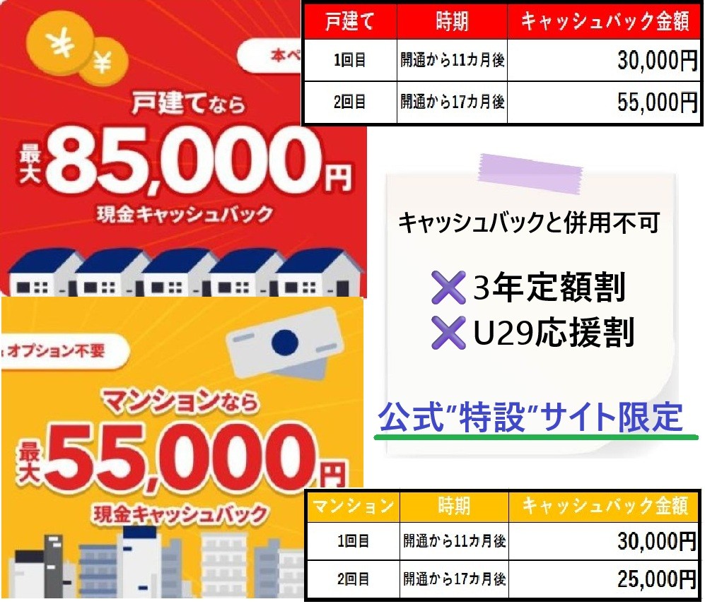 | キャンペーン・特典の種類 ※併用不可以下参照 | ・キャッシュバック最大85,000円(戸建て) ・キャッシュバック最大55,000円円(マンション) ・工事費無料49,500円 ・3ねん定額割(戸建て) ・2ねん定額割(マンション) ・U29応援割 |