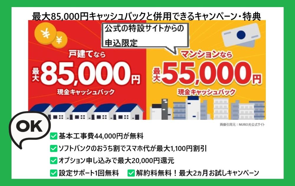 ✅公式特設サイト限定の最大85,000円キャッシュバックキャンペーン・特典は、以下のキャンペーン・特典とは併用不可ですので、注意しましょう!