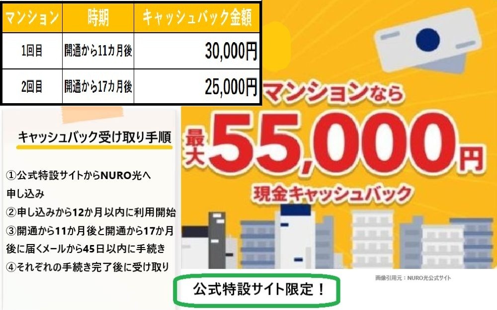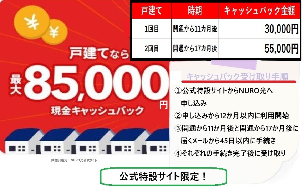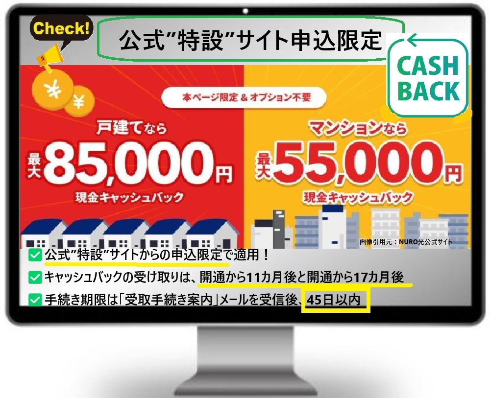 NURO光では、公式の”特設サイト”からの申込限定で適用される「最大85,000円」キャッシュバックが最もお得です。