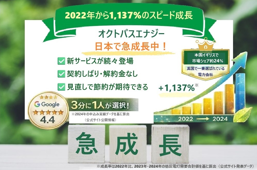 ※本表の数値・実績は、オクトパスエナジー公式サイトおよび公式プレスリリースに基づいています。