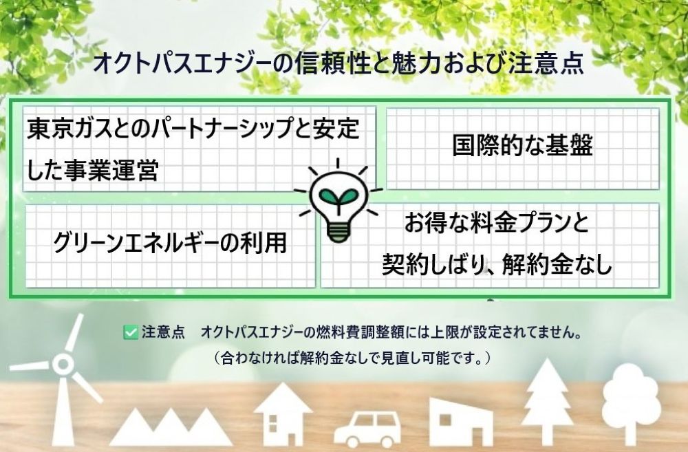 契約期間や解約金が発生しないため、契約後の自由度も高く、お試しで利用しても損のない選択肢ですが、オクトパスエナジーの注意点「燃料費調整額」については、しっかりと確認しましょう!