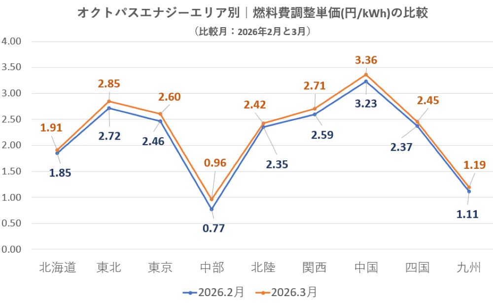 エリア別|燃料費調整単価の比較(2026.2月と3月と年間平均)