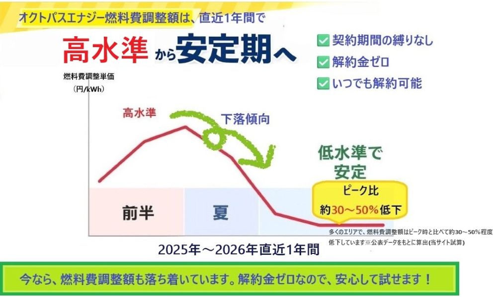 今はオクトパスエナジーの燃料費調整額が落ち着いており、電気代も安定しています。だからこそ、電気代を見直す絶好のタイミングです。